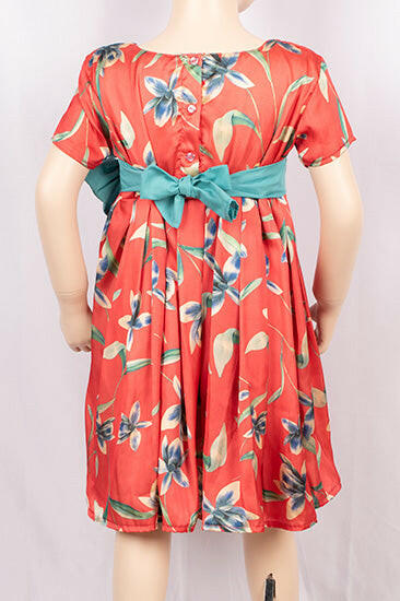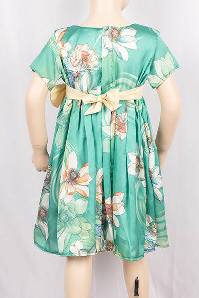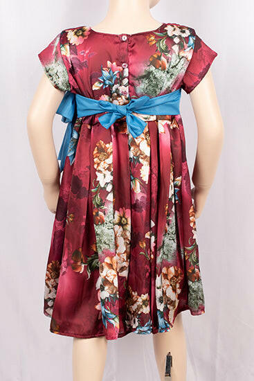 Girls short sleeve silk frock dresses with a cute bow with belt. A beautiful, cute & comfortable collections of girl’s dresses with a soft comfy inner and 100% Samu silk polyester. Suitable for any season.  Available Colour: Blue Mint floral print on dusty Orange, White Blue floral print on dusty Maroon, and White Cream floral print on dusty Mint.
