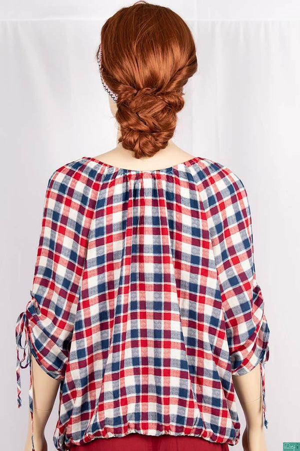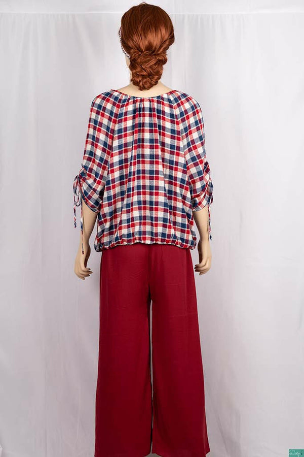 Ladies pintuck tie neck design 3/4 sleeve casual fit baggy tops in Various check colours.