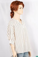 Ladies pleated design 3/4 sleeve loose fit tops with round collar and V placket neck in Black Yellow Stripe on White. A beautiful, soft smooth & comfortable Stylish work outfit tops with 100% cotton. Suitable for all weather.