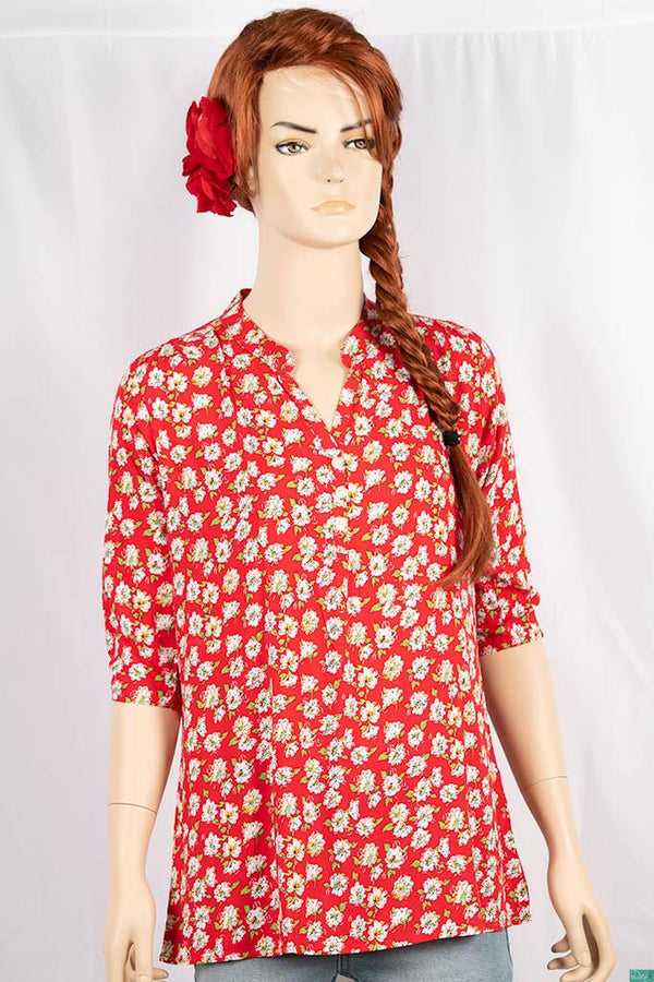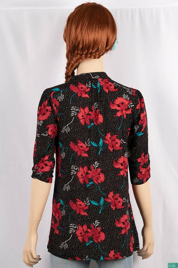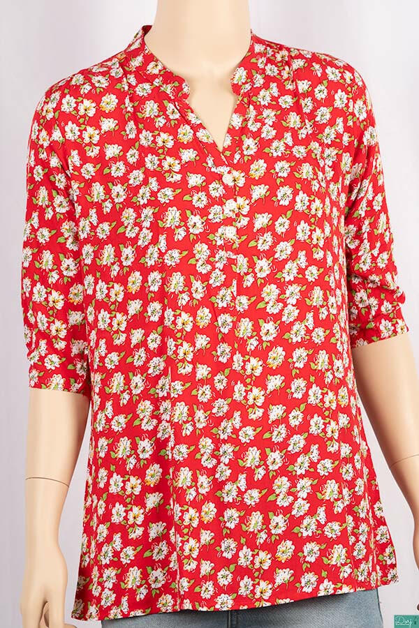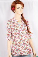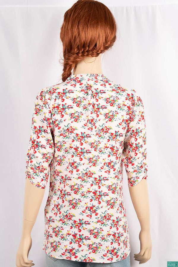 Introducing our Ladies Floral Tops, a must-have for your spring and summer wardrobe. These tops feature a stylish 3/4 slightly smocked sleeve, round collar with v-placket neck, and various floral designs in vibrant colours. Made with 100% cotton for ultimate comfort. Perfect for any casual occasion.